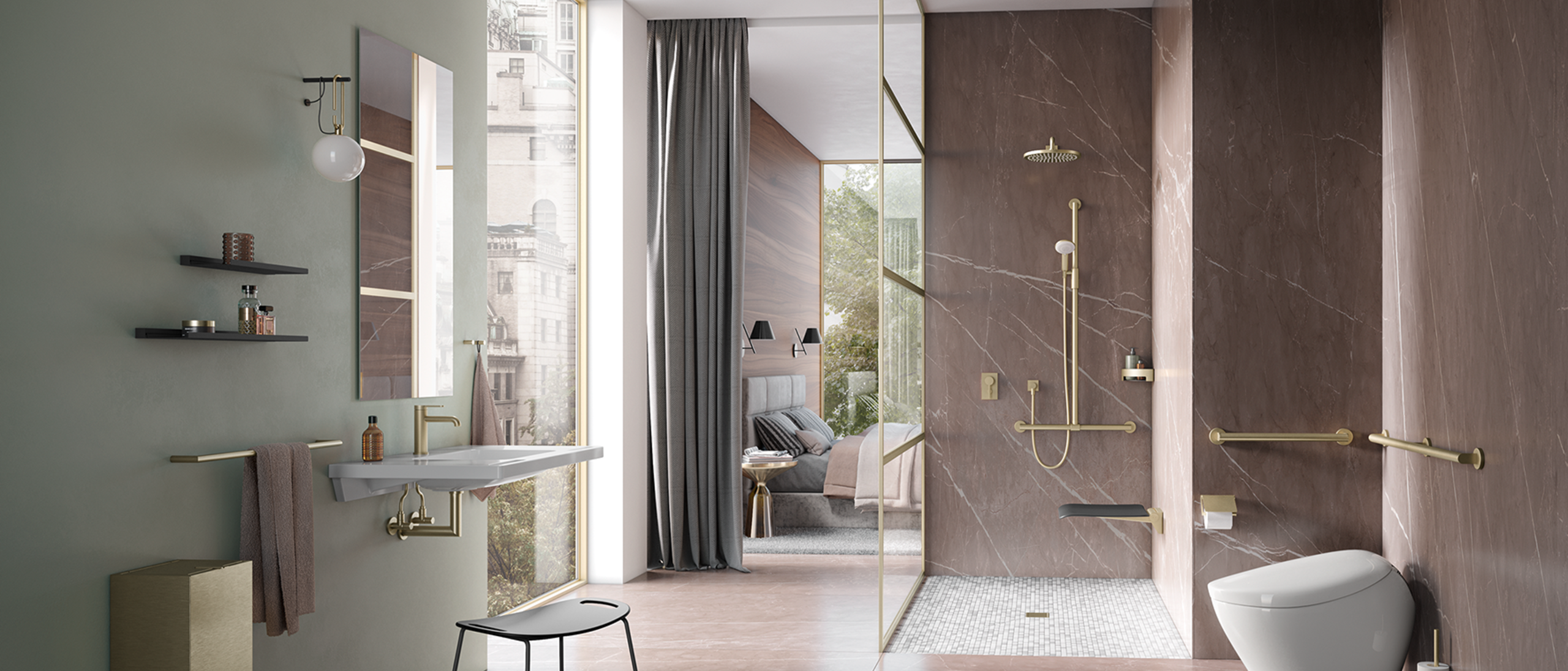 Trotz der DIN-Anforderungen, die es umzusetzen gilt, müssen sich Barrierefreiheit, Komfort und Design nicht ausschließen – ganz im Gegenteil. Bei HEWI werden diese Themen zu einer festen Einheit. Mobile Lösungen von HEWI erlauben es, das barrierefreie Hotelzimmer ganz an die Bedürfnisse der Nutzenden anzupassen. System 900 beispielsweise passt sich flexibel an. Dank mobiler Duschsitze und Stützklappgriffe können Hotels jeden Raum binnen weniger Sekunden in ein barrierefreies Hotelzimmer umbauen. Ist die mobile Lösung nicht mehr nötig, verschwindet sie dezent hinter einer Abdeckung der Montageplatte.