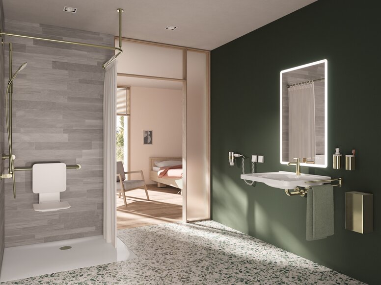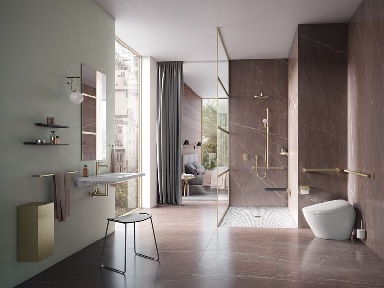 Edle Anmutung im barrierefreien Sanitärraum. Der bewährte HEWI Stützklappgriff in Messing glänzend bringt Wärme und Wohnlichkeit in Badezimmer.