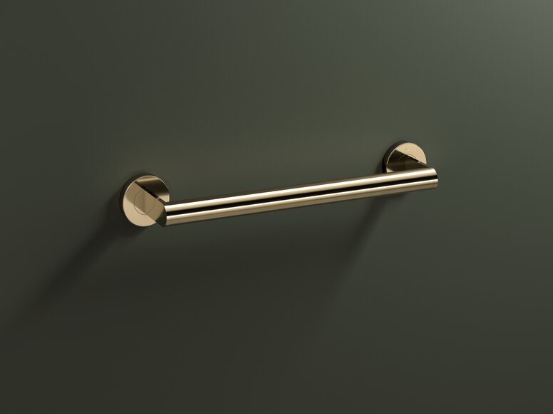 Ein sorgfältig gestaltetes Detail für die hochwertige Ausstattung von Sanitärräumen: Handtuchhalter von HEWI in der neuen Designoberfläche Messing glänzend.