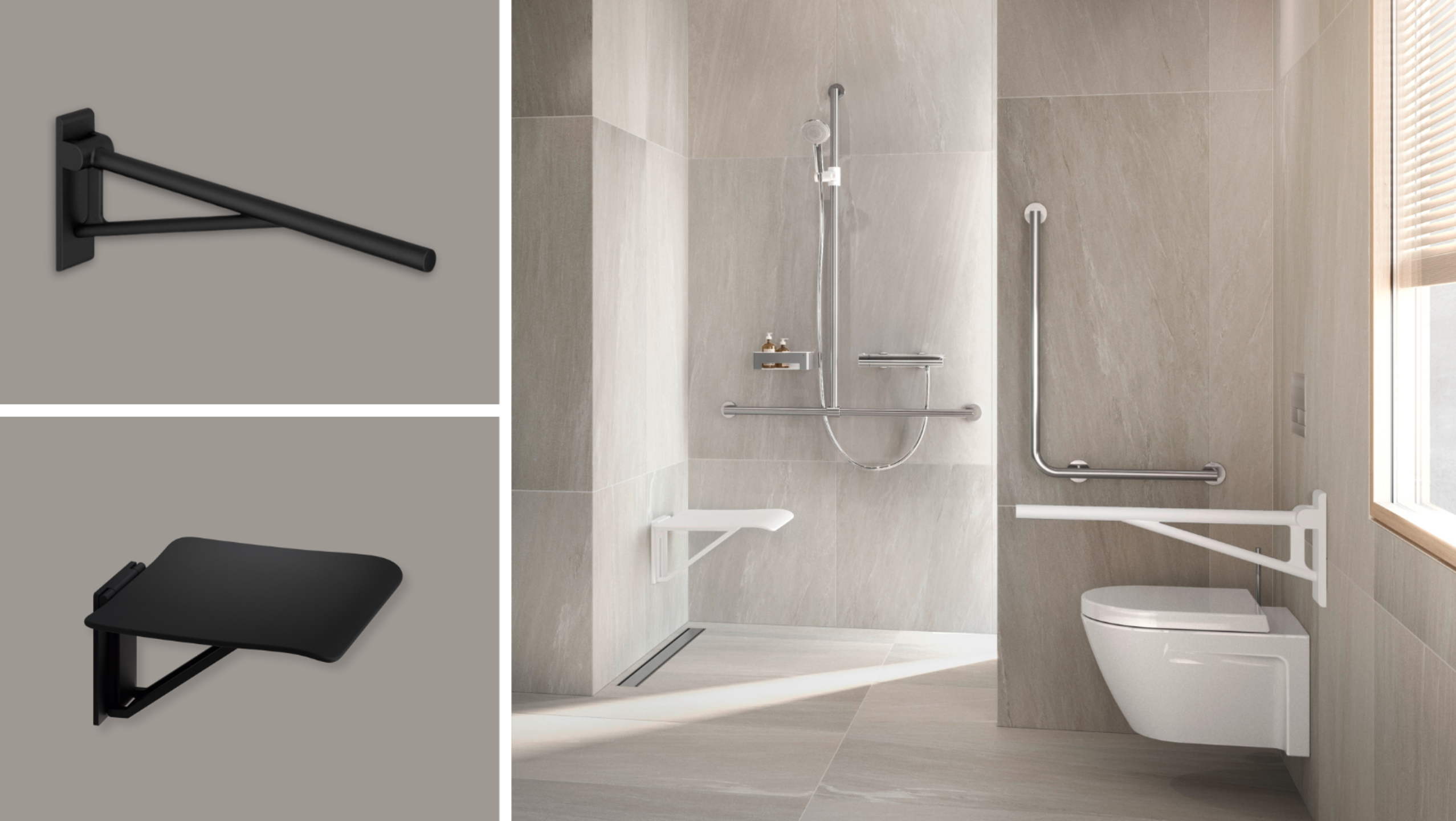 System 162 can be ideally combined with the universal products in classic black and white.The colour variants open up a wide range of design options that can be harmoniously integrated into any bathroom. The fold-up shower seat and the folding support handle offer maximum comfort and safety and can be flexibly adapted to different needs.