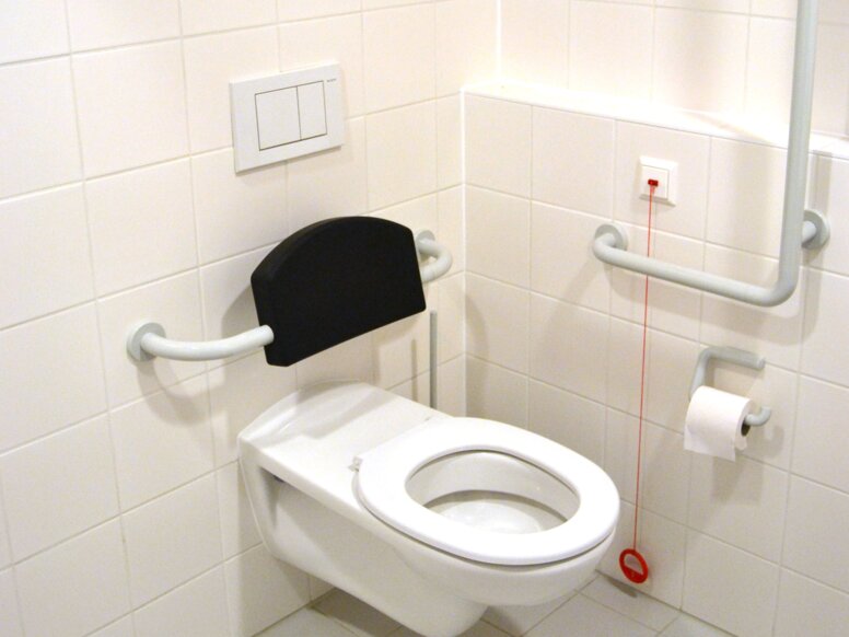 LifeSystem from HEWI was used in the bathroom. Folding support handles on washbasin and WC provide support and assist the movement sequences. The shower has a railing system. This offers the advantage that it can be used as a stable holding device as well as a shower seat if required. Everything in the bathroom is designed to be easily accessible for wheelchair users: the washstand can be driven underneath, the toilet has a back support, and there is also a folding support handle with a second level of grip, which makes it easier to transfer from the wheelchair to the toilet.