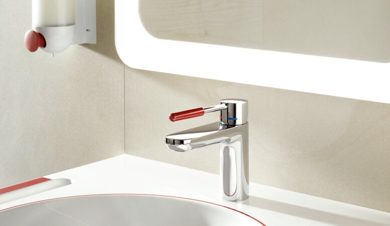 - Single lever washbasin mixer: Single-lever taps impress with their intuitive and easy use. Thanks to its hot/cold mark, use and temperature setting is child's play. With the colour-highlighted control element of the single-lever washbasin mixer in the familiar HEWI colours, the area of use is visualised and made perceptible by feel. The handle element is made of high-quality polyamide and is pleasant to grip. Thanks to the variety of colours, this model in the colour red is suitable for dementia patients. You can find out how this special colour affects the disease and how to design a bathroom for dementia patients in this article.