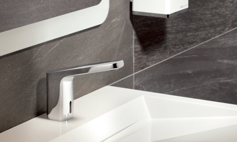 - Sensor-controlled fittings: These taps trigger the water flow with a hand movement and stop it automatically after a preset time interval. This simplifies handling and people with physical impairments are given the chance to shape their everyday lives in a self-determined way. Sensor-controlled variants also offer extra hygiene. By not touching the fitting, pathogens are transferred less easily and infections are reduced. Another advantage of electronic fittings, apart from being barrier-free, is that they actively conserve the scarce resource of water.