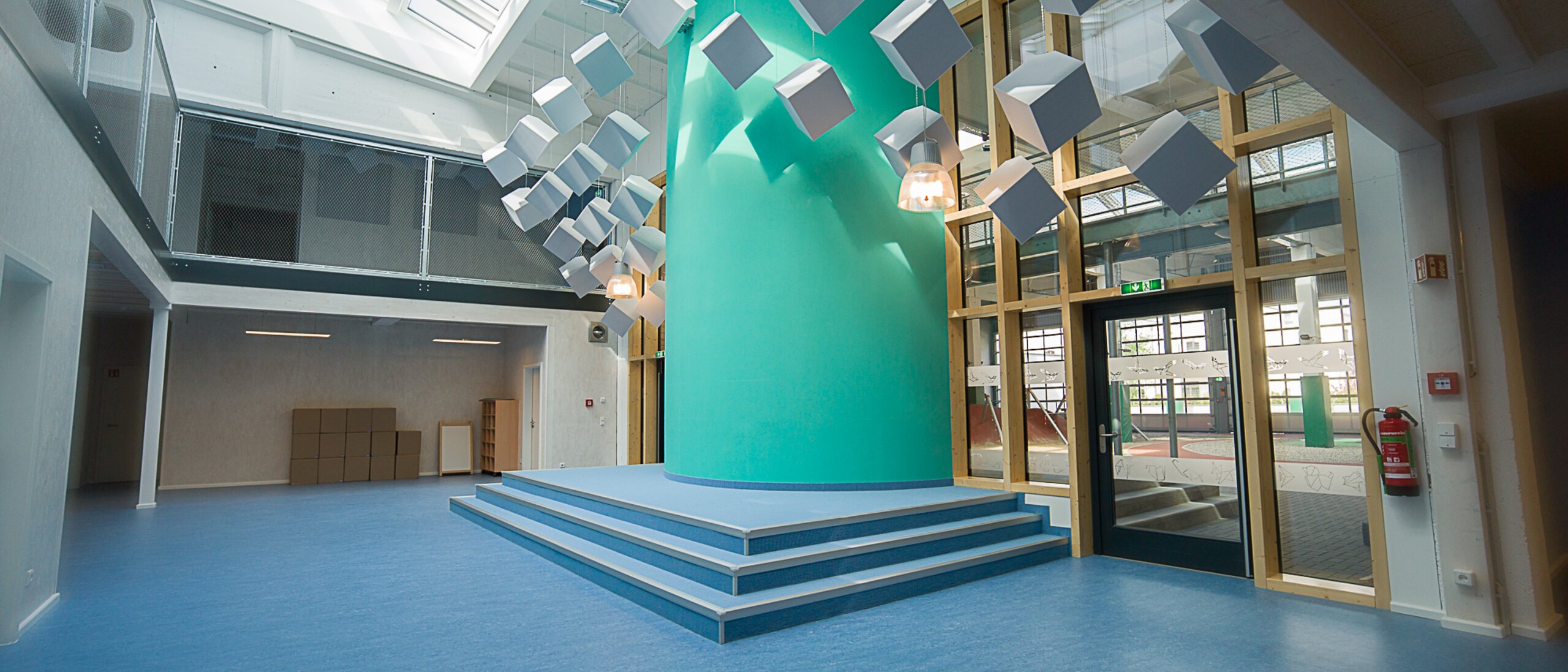 La scène légèrement surélevée est également située dans la zone entre le bâtiment principal et l'espace intérieur. La crèche l'utilise pour divers événements et spectacles et propose également un escalier en colimaçon adapté aux enfants pour accéder à la galerie à l'étage supérieur. Il est bien sûr conçu pour être à l'épreuve des enfants grâce à un filet en acier inoxydable.
