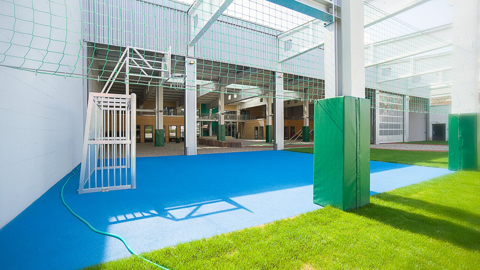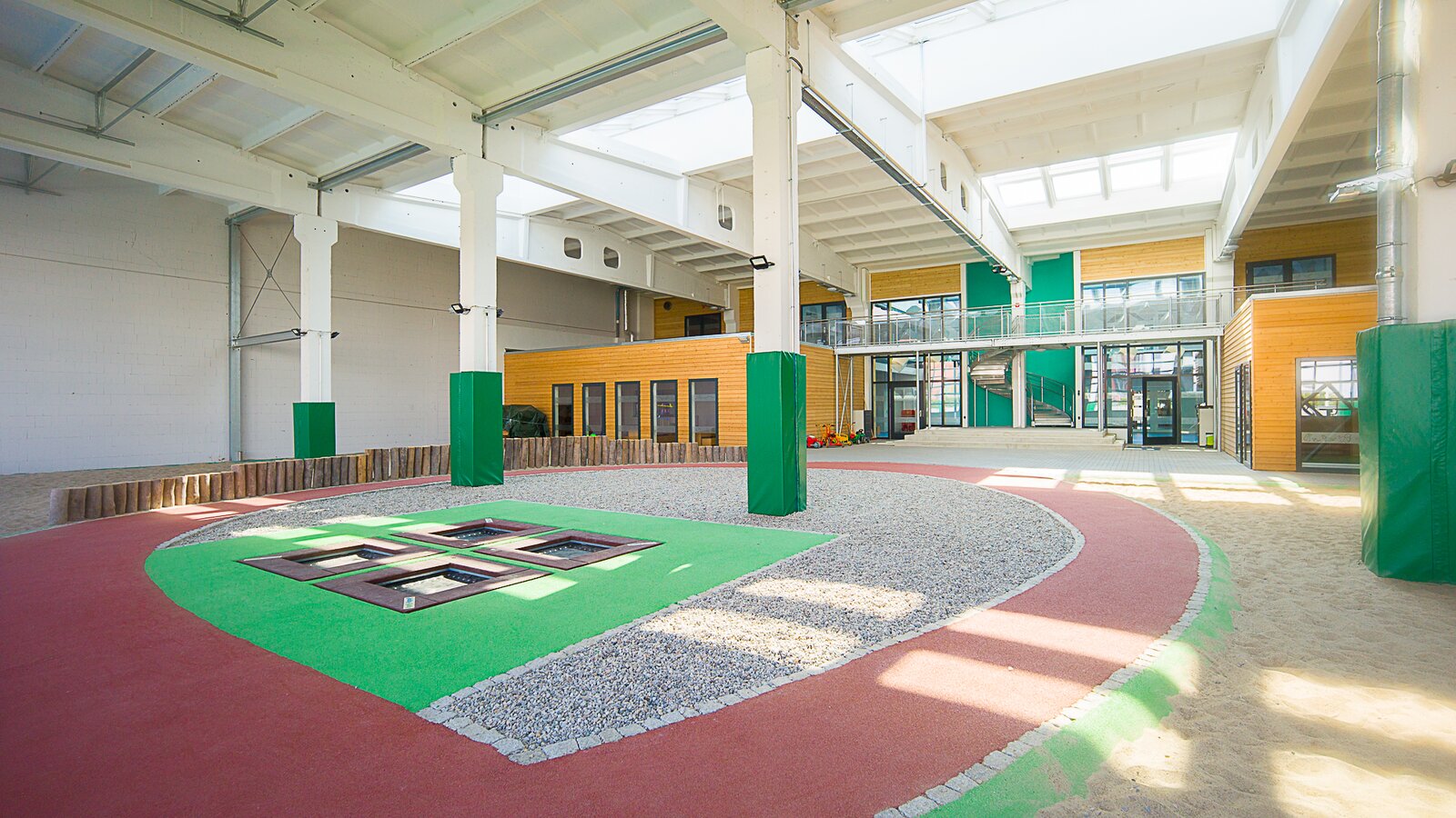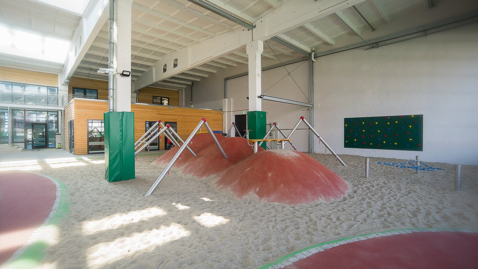 Les deux tiers restants de la surface totale sont occupés par la salle de jeux couverte, qui est reliée à l'espace extérieur par six portes roulantes ouvrables. Dans l'aire de jeu intérieure, les plus petits ont de nombreuses possibilités de jeu et d'exercice : trampolines, mur d'escalade, aire de jeu de sable avec un cadre d'escalade en forme d'araignée et une piste de scooter en forme de huit. Lorsque les portes sont ouvertes, la transition vers l'espace extérieur se fait en douceur et les enfants peuvent utiliser l'espace en gazon naturel et le terrain multifonctionnel pour pratiquer différents sports comme le handball, le football ou le basketball