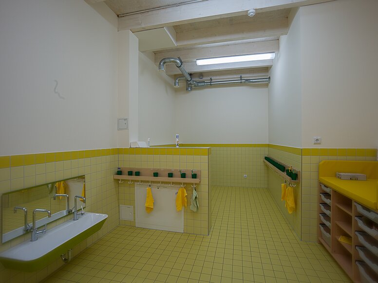 Se laver les mains et se brosser les dents sont beaucoup plus amusants dans la KITA in der Kammgarnspinnerei lorsque la conception du lavabo est adaptée aux besoins des petits utilisateurs. Les solutions HEWI aux couleurs gaies autour du lavabo sont une invitation à se laver et à s'éclabousser.