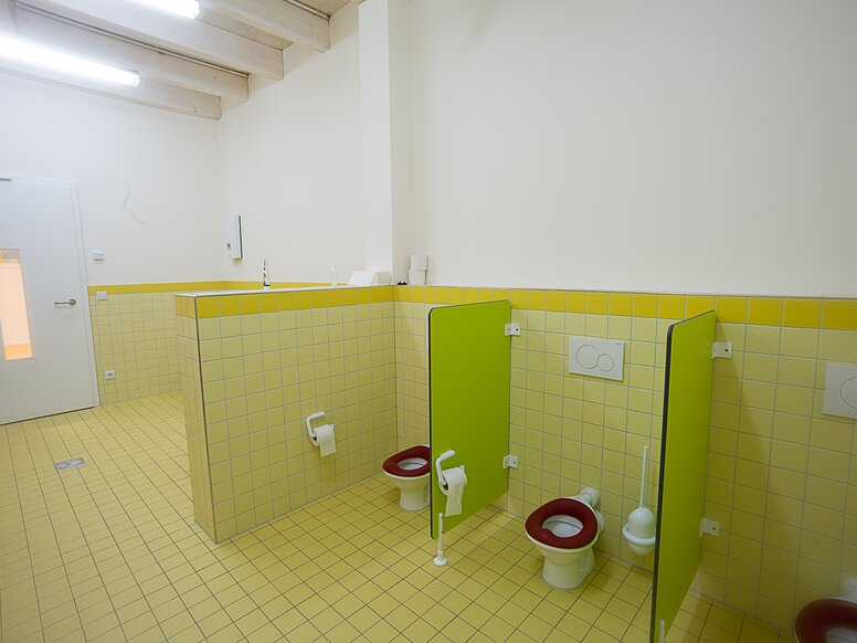 L'éventail des solutions proposées par la KITA dans la Kammgarnspinnerei comprend des lavabos, des miroirs, des garnitures, des rails pour gobelets de brosses à dents et des accessoires tels que des distributeurs de savon ou des porte-rouleaux de papier toilette. Dans la KITA de la Kammgarnspinnerei, des solutions d'équipements sans barrières dans les sanitaires aident également les enfants à les utiliser