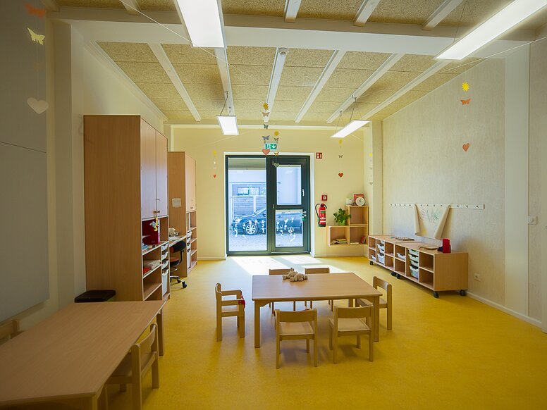 Dans l'ancien hall de production, un tiers de la surface est occupé par la maison construite à l'intérieur. Vous y trouverez les différentes chambres adaptées à l'âge ainsi que les installations sanitaires. Le rez-de-chaussée abrite la crèche et le jardin d'enfants ainsi que la salle à manger, qui sert également de salle multifonctionnelle. Au premier étage, en plus de la crèche, des salles du personnel et des services du bâtiment et de la zone administrative, il y a également des salles fonctionnelles et de jeux qui sont utilisées par tous les enfants de la crèche.